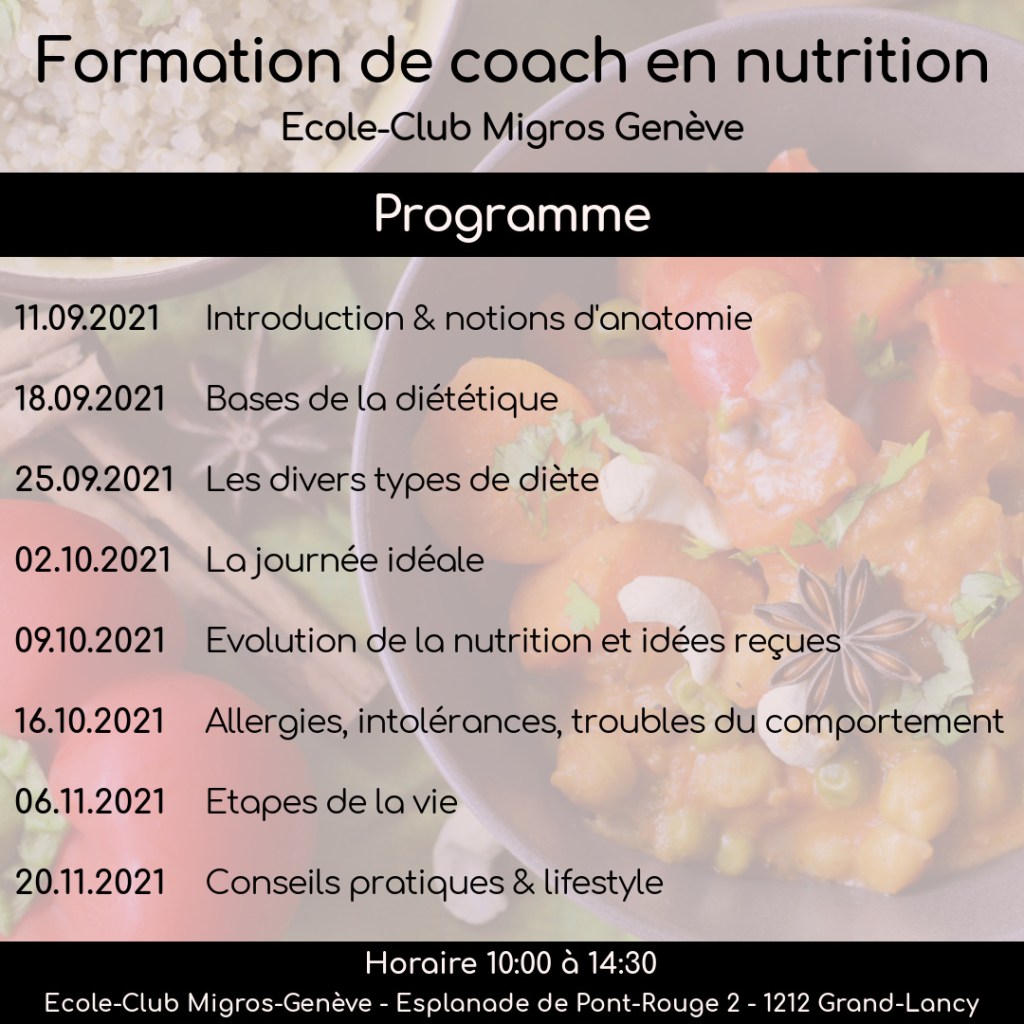 Après une première édition l’automne dernier, je suis ravie de vous annoncer mon partenariat avec l’Ecole-Club Migros et la nutritionniste Sonia Lambiel se poursuit : une seconde édition de la formation certifiante en nutrition débutera le 2 février 2022, sur le même modèle que la première.